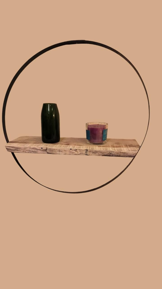 Étagère en chêne massif réalisée avec un cercle de fût de chêne en métal.