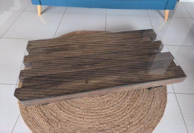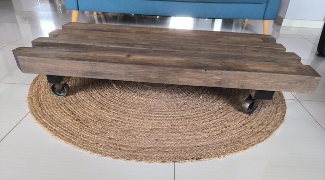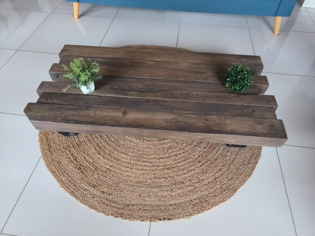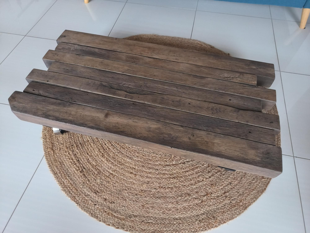 Table basse sur roulettes en chêne massif réalisée avec d'anciennes poutres.